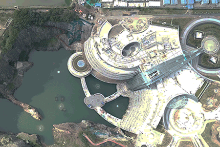 从航拍照片来看,坑的形状就像一个巨大的太极。 洁白明亮的坑酒店主体是太极图的阳鱼。 海底世界就是太极图的阴鱼。 连太极图的阴阳鱼眼都……安排好了。